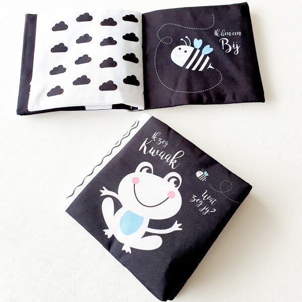 Lief zwart/wit stoffen babyboekje dat knispert van " Hello Baby " Heerlijk voor je baby om mee te spelen. Zien, horen en voelen in één speeltje.