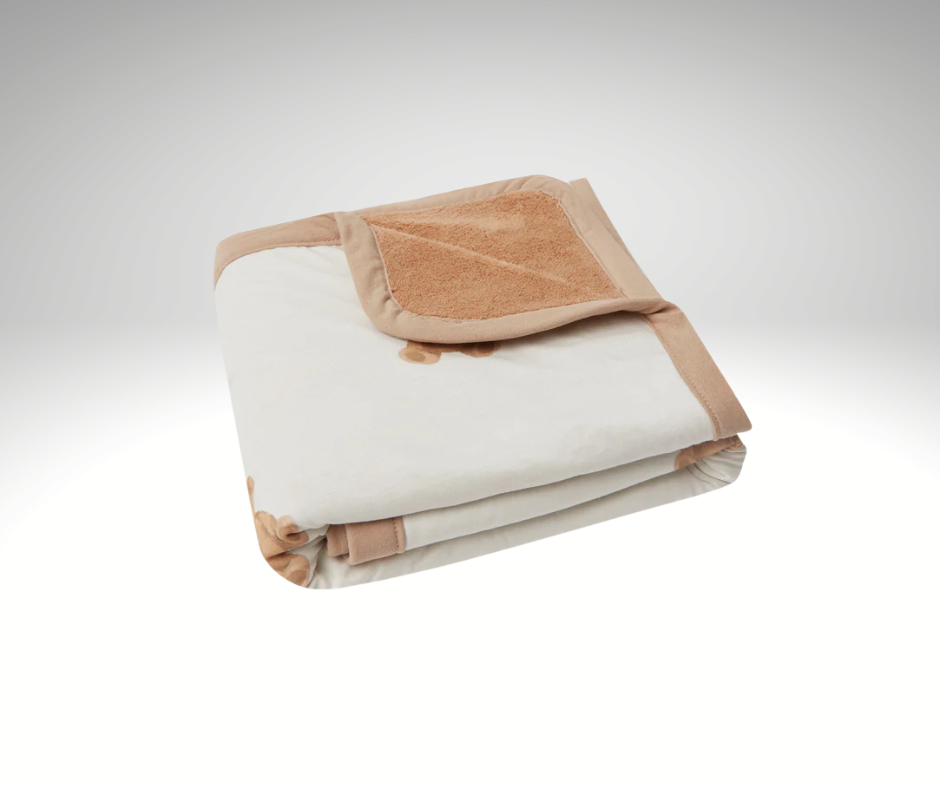 Deze deken heeft een Ivory ondergrond en de beertjes op de print hebben de kleuren Biscuit en Chestnut. De achterkant van het dekentje is gemaakt van fleece in de kleur Biscuit.