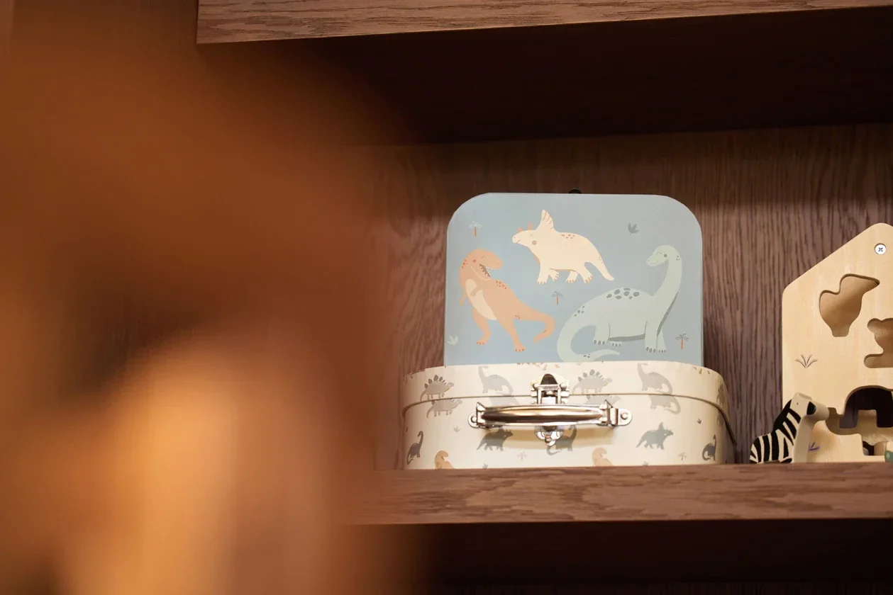 Roar! Ligt bij jullie de kinderkamer ook lekker vol met speelgoed? Met deze speelkoffertjes kan je deze items gemakkelijk opbergen. Deze 2 pack heeft 1 groter koffertje met een all-over print en 1 kleiner koffertje met drie stoere dino's! Welk kleintje moet deze koffertjes echt hebben?