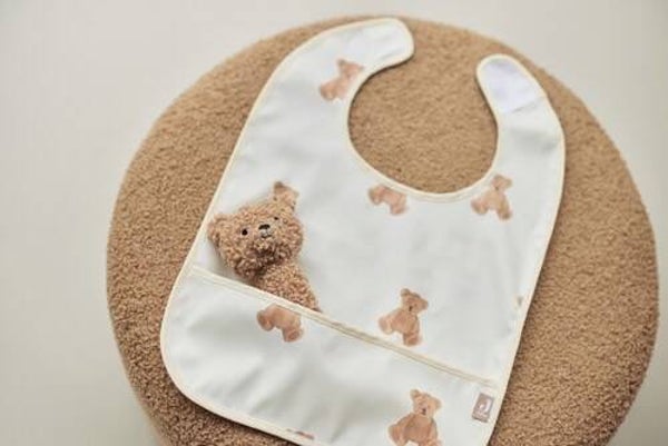 Deze slabben zijn geweldig. Ze beschermen de kleertjes van jouw baby of dreumes. En waarom er aan de onderkant een dubbel laagje stof zit? Daar is over nagedacht! Je kindje laat tijdens het zelfstandig eten geregeld voedsel langs de kin over de slab druipen. De onderste rand van de slab vangt deze klodders en stukjes op. Een opvangbakje dus! Dát ga je waarderen! De vloeistof en klodders op de voorzijde lekken niet door op de kleding. Dit komt door het waterproof materiaal waarvan deze slab is gemaakt. Je sluit de waterproof slab met klittenband aan de achterzijde. Dat blijft goed zitten waardoor je baby niet gemakkelijk zelf de slab kan uittrekken. De slab is afneembaar met een vochtige doek. De slab heeft een leuke Teddy Bear print.