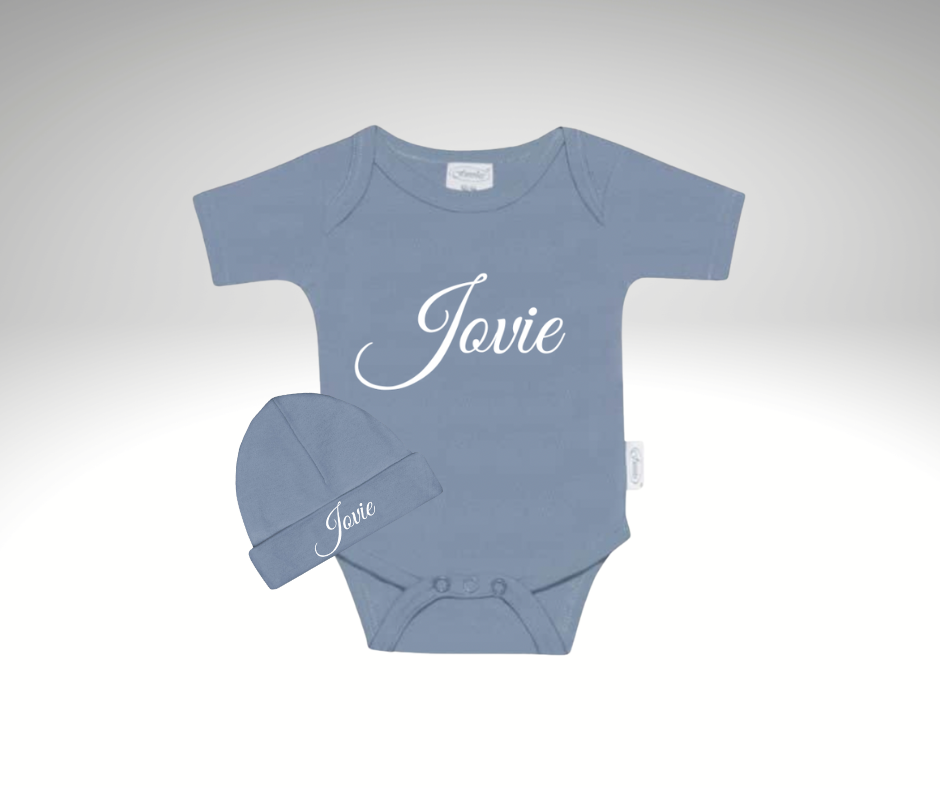 De allereerste foto’s van een baby worden vaak gemaakt met een schattig mutsje op. Waarom niet meteen een rompertje en mutsje kiezen dat de wereld laat zien hoe jullie kleintje heet?