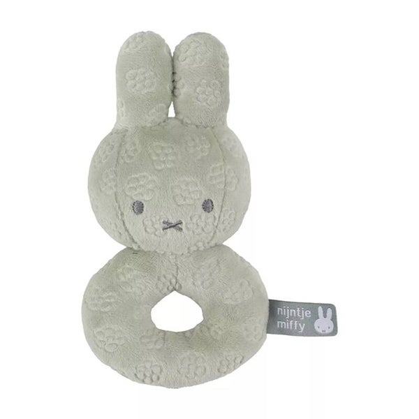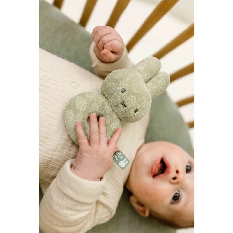De Nijntje rammelaar Green Flower is het perfecte eerste speeltje voor je kleintje! Dankzij het handige formaat is hij makkelijk vast te pakken door kleine handjes. Binnenin zit een vrolijk belletje dat een zacht geluid maakt, wat niet alleen voor plezier zorgt, maar ook de zintuigen van je baby stimuleert. De rammelaar is gemaakt van een zachte stof en voorzien van een schattig bloemetjespatroon, waardoor hij extra knuffelbaar is. Dit speeltje is geschikt vanaf de geboorte en biedt veel speelplezier voor jouw baby.