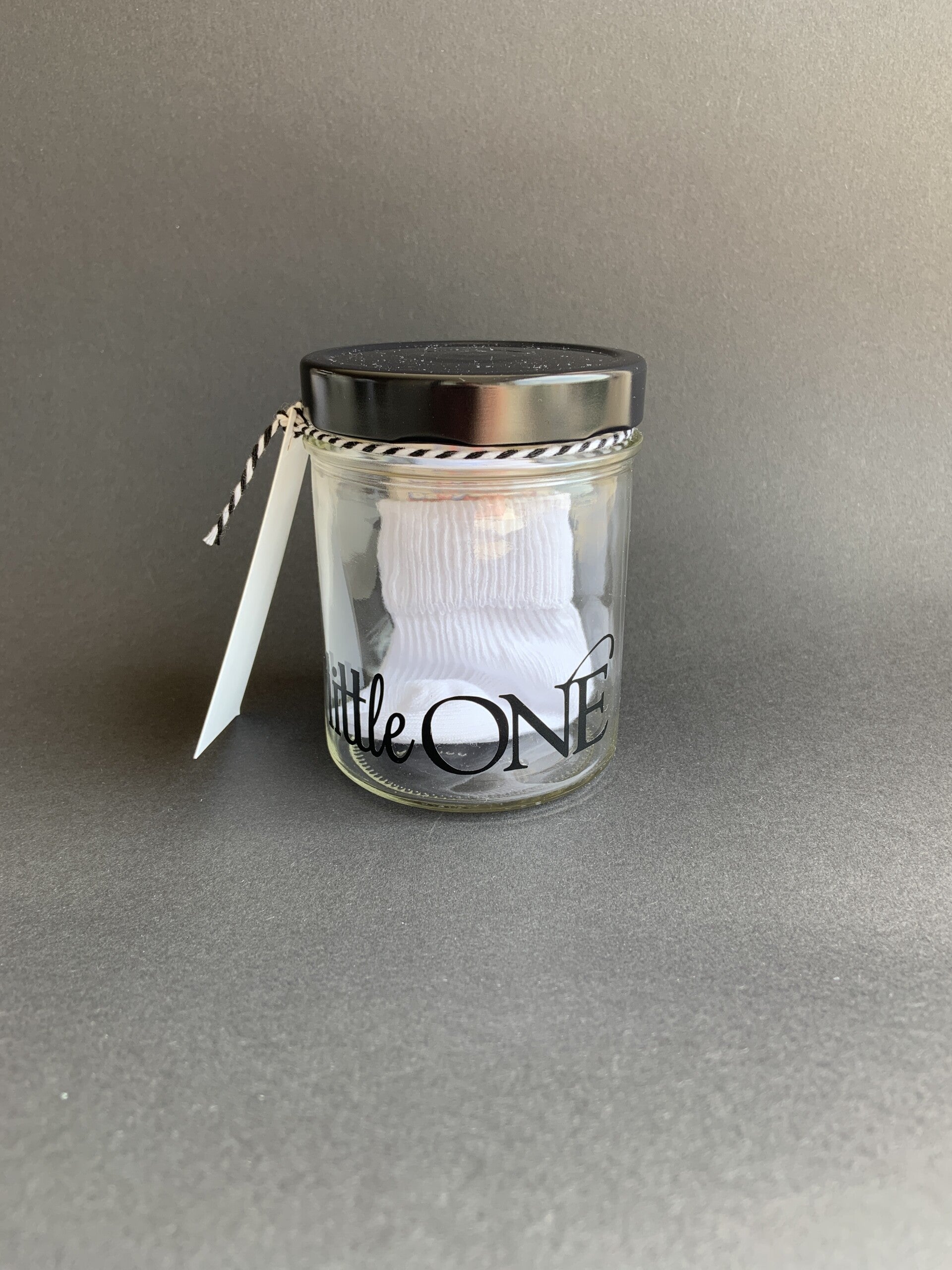 Gewoon een leuk potje met een zwarte deksel. Aan het zwart/wit gestreepte koordje hangt een leuk kaartje met tekst! Het printje op het glas en de sokjes maken het compleet. Zo wordt een gewoon potje toch heel speciaal.